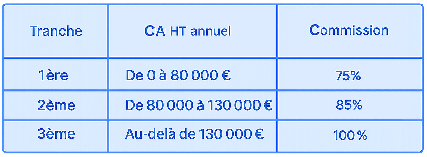 - Dans le cas où le sourcing du lead provient du mandataire, le pourcentage de la commission est progressif en fonction du montant HT annuel encaissé par le mandant, et détaillé comme suit :